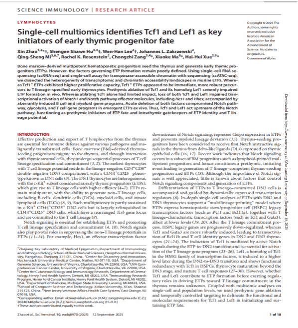 在基础医学方面,T淋巴细胞在人体免疫系统中扮演着关键角色,参与清除病原体与抵抗感染,对肿瘤新型疗法、自身免疫疾病调控以及白血病的发生发展中发挥重要作用。长期以来,学术与临床医学领域存在一个关键问题尚未完全阐明:T淋巴细胞发育最初阶段的调控机制是什么?通过与杭州师范大学、美国弗吉尼亚大学等单位进行深度医工合作,对该问题作出了深入解答。