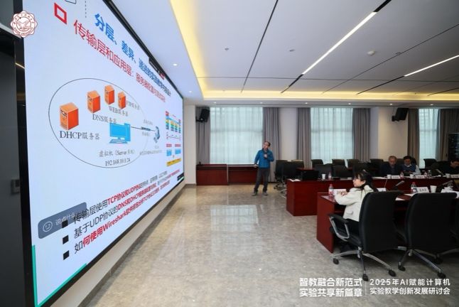 接下来,杨力代表实验中心作年度工作汇报。他从年度建设基本情况、工作进展、建设成效与未来规划等四个方面,全面展示了中心在服务全校大规模实验教学、建设信创与国产化实训平台、深化校企合作、探索AI赋能实验教学以及推动实验资源开放共享等方面取得的成果,介绍了在新的形势和机遇下实践中心对来的思考和规划。中心骨干教师刘进、李欣荣则分别就“人工智能赋能计算机网络实践教学改革”与“微机原理与系统设计实践教学改革”进行了专题汇报,分享了如何在课程中利用AI技术构建智能辅导、个性化学习路径及虚实融合实验环境的具体实践与思考。