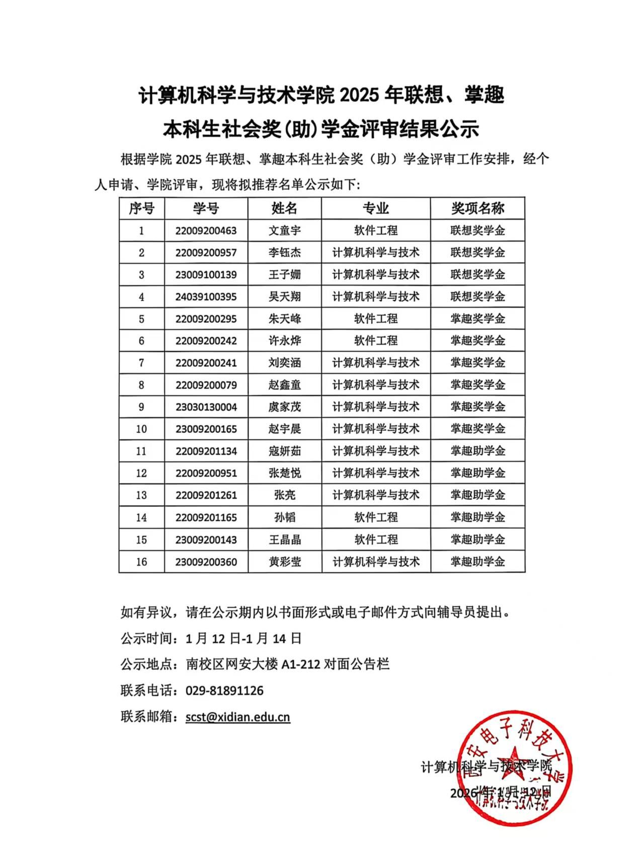 yl7703永利集团2025年联想、掌趣本科生社会奖(助)学金评审结果公示