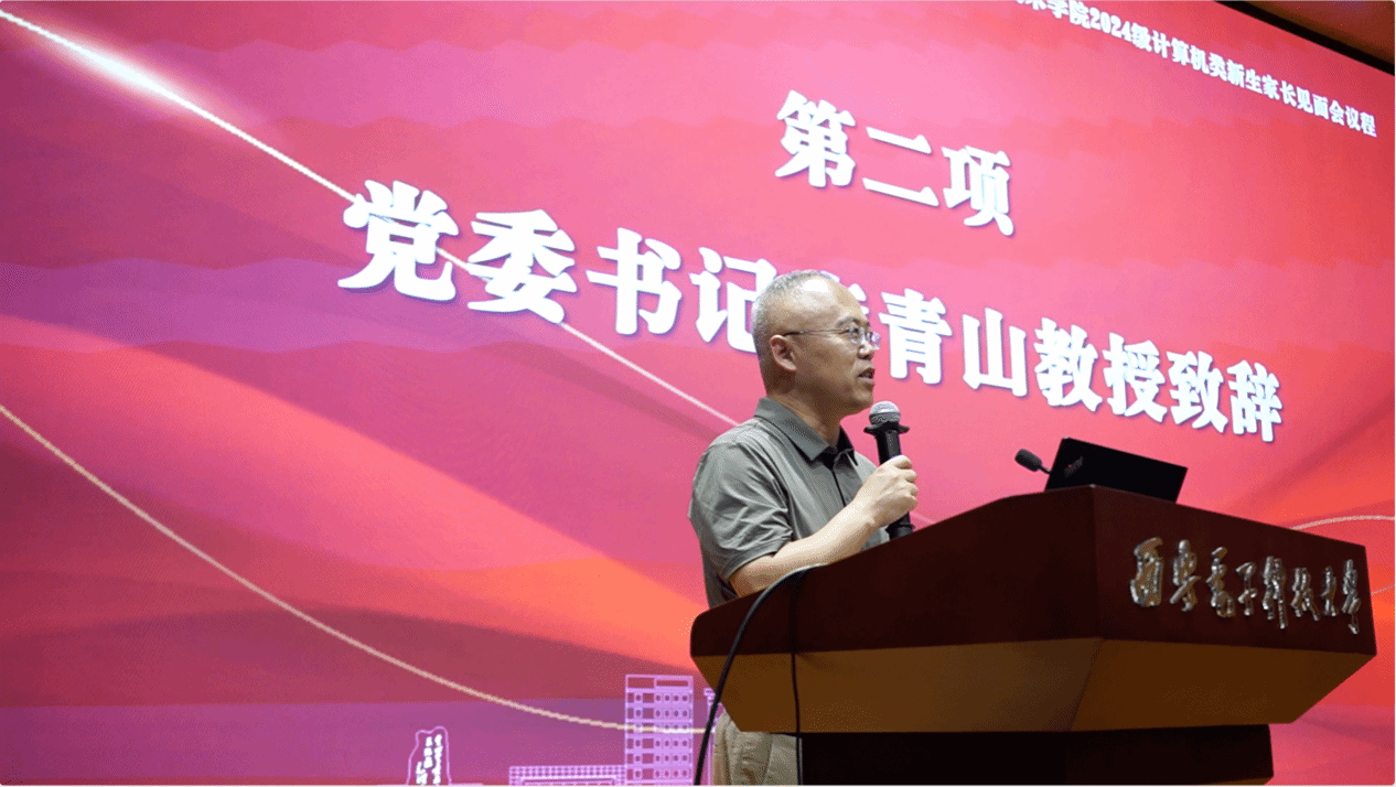 随后,学院党委书记李青山教授致辞。李青山的致辞围绕“欢迎、自豪、传承、共育”四个方面展开。首先,他以西电的红色基因和电子信息特色为引,对各位家长将孩子们送到西电、送到yl7703永利集团表示欢迎;其次,他结合学院的历史地位和现实成就,表示家长们应为孩子们加入计科院大家庭而感到自豪;然后,他对建院六十余年凝练出的“三系精神”内涵和“严谨、担当、勤勉、开放”的院训进行解读,并希望在座的各位家长们能够在未来感受到这份精神传承对孩子们的积极影响;最后,希望在个人、学校、家庭、社会的协同共育下,帮助学生成长为德才兼备、身心健康的计科人,做“三系”精神的传承者,勇担时代重任,在实现中华民族伟大复兴的时代洪流中踔厉奋发、勇毅前进,奋力书写属于他们的人生篇章。