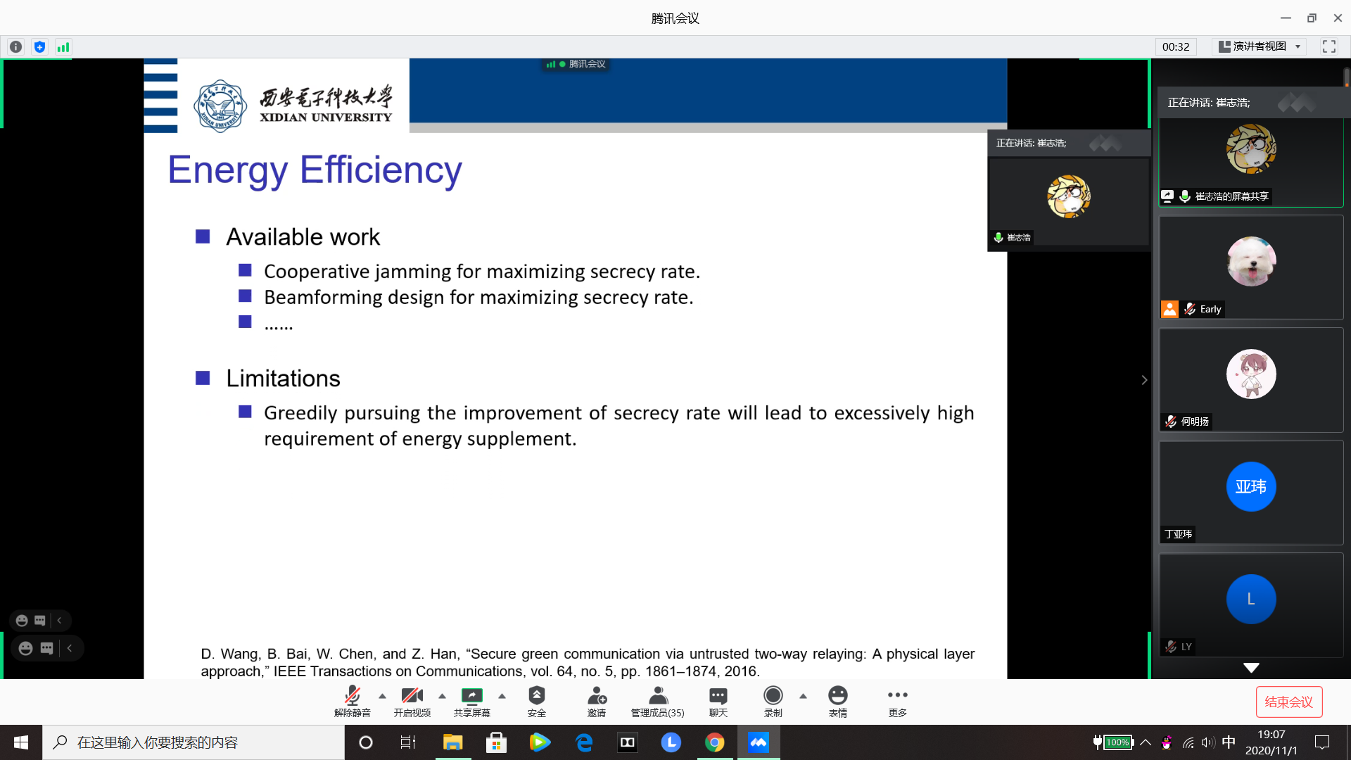 来自计算机网络与物联网工程研究所本硕博师第一联合党支部的博士研究生赵双睿同学,以保密能量效率为主题,具体介绍了一种低复杂度波束成形设计方案。硕士研究生崔志浩同学以云计算的概念为切入点,介绍了云安全典的迫切需求和行业痛点,介绍了研究所保护云计算安全的完整产品体系和研究所已取得的一些成就等。在问答环节,线上线下的听众积极提问,与报告人开展了积极有效的互动交流。