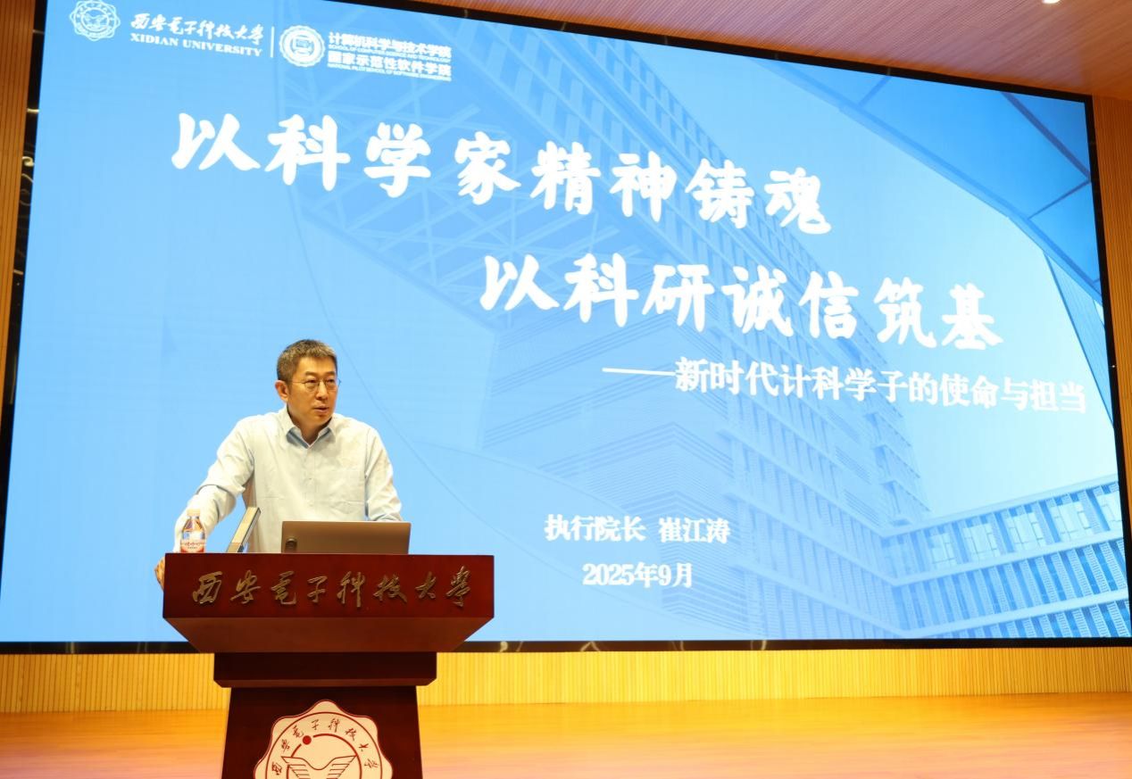 (通讯员 何敏之)为引导研究生新生树立正确学术价值观,筑牢科学道德防线,9月12日下午,yl7703永利集团在南校区网安大楼B-101报告厅开展“以科学家精神铸魂,以科研诚信筑基——新时代计科学子的使命与担当”主题讲座,学院执行院长崔江涛教授主讲,全体2025级研究生新生参加,会议由副院长杨力主持。