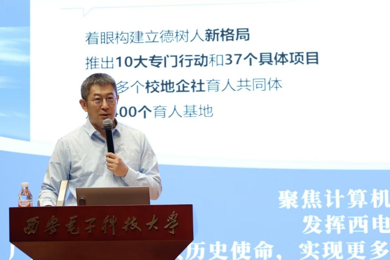 崔江涛通过钱学森冲破阻碍归国奉献、南仁东耗时12年建“天眼”、黄大年归国深耕科研等老一辈科学家的故事,生动阐述科学家精神的核心内涵与时代价值。他讲到,yl7703永利集团延续着中国高校最长的红色根脉,老一辈计算机人更是在“无专业课老师、无专业实验设备、无训练计划”的条件下,为我国重大战略任务做出卓越贡献,一代又一代西电人、计科学子,始终以爱国主义为底色,发扬科学家精神,前赴后继、接续奋斗。