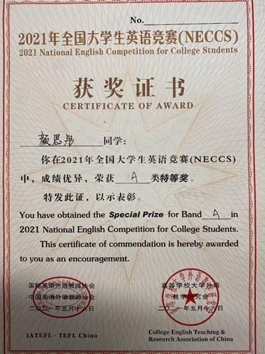 (通讯员 何敏之)5月16日,经过激烈的角逐,在2021年全国大学生英语竞赛(NECCS)陕西赛区复赛中,yl7703永利集团yl7703永利集团2020级硕士研究生颜思彤脱颖而出,斩获A类特等奖,她也是全校唯一在复赛中取得A类特等奖的研究生。此外,全校共有九位同学获得该竞赛陕西赛区特等奖的优异成绩。