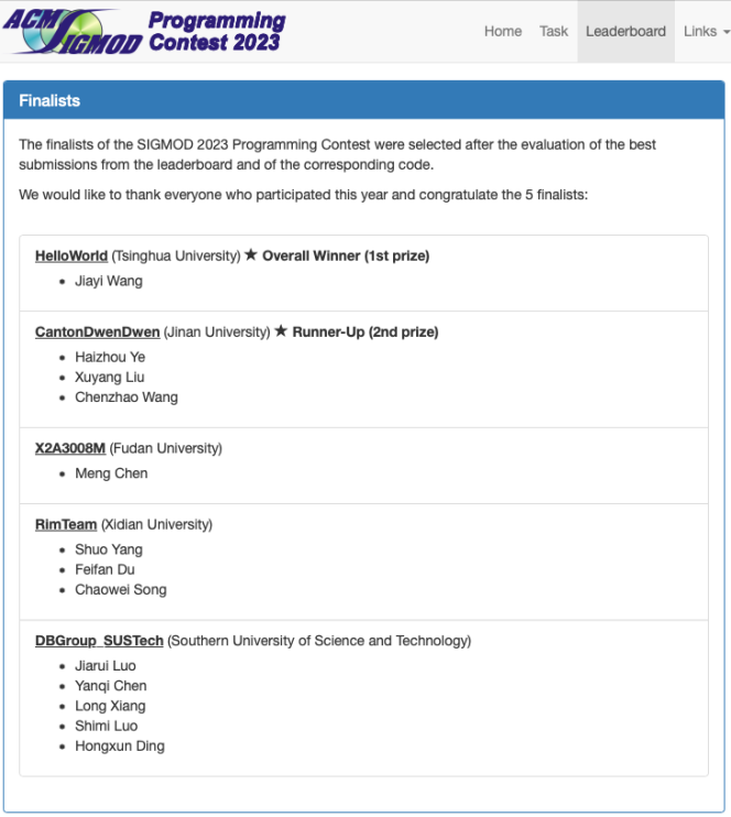 据悉,ACM SIGMOD是美国计算机协会ACM下属的SIG系列学术会议,始办于1970年。目前SIGMOD是国际上公认的在数据管理、数据库、数据科学方向具有最高学术地位的国际会议。每年的SIGMOD程序竞赛题目取材于工业界所面临的各种数据管理难题,旨在促进全球各高校和科研院所的数据科学专业研究生和博士生的学术交流,提高解决实际问题的能力。