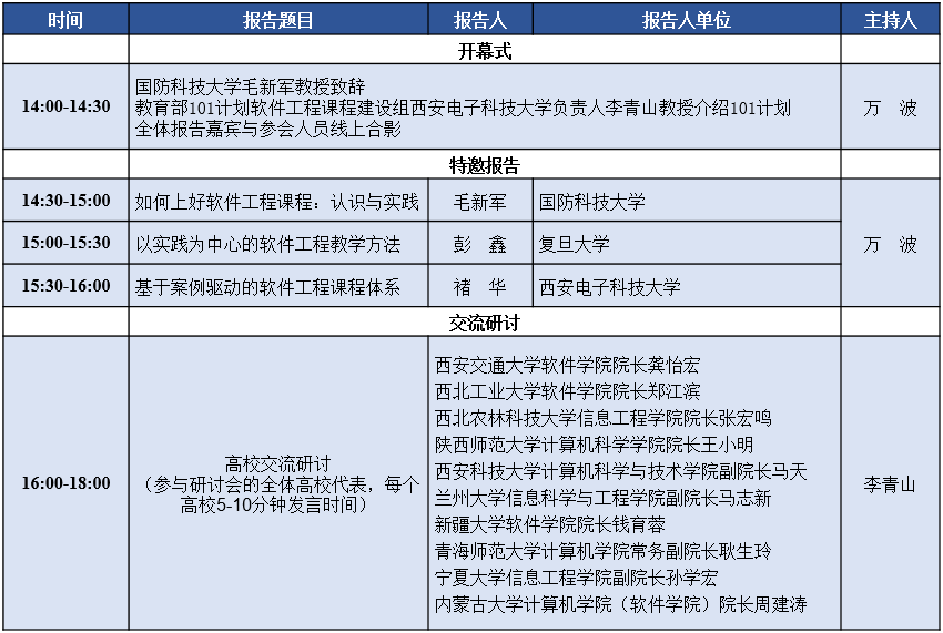 本次西北地区高校软件工程课程建设研讨会,邀请国防科技大学、复旦大学、yl7703永利集团、西安交通大学、西北工业大学、西北农林科技大学、陕西师范大学、西安科技大学、兰州大学、宁夏大学、青海师范大学、新疆大学、内蒙古大学等西北地区高校,通过特邀报告、交流沙龙等形式,交流软件工程课程教学和教改的成果,分享软件工程课程教学资源,商讨软件工程课程教学中遇到的各类困难和问题,提升软件工程课程建设水平。