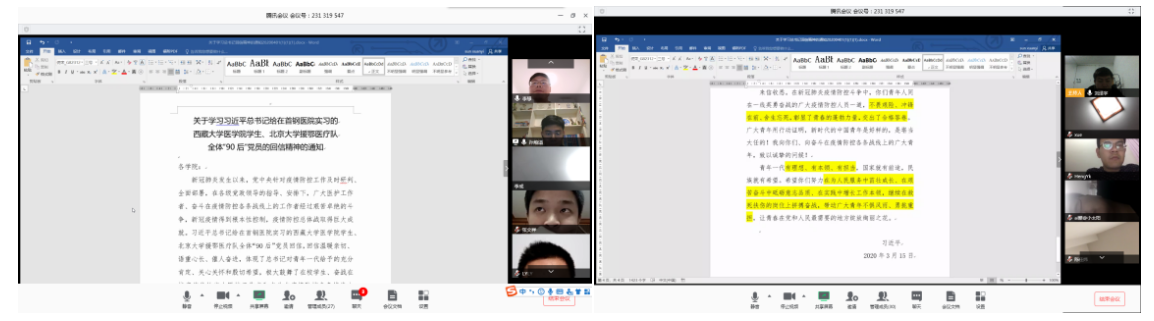 (通讯员 刘泽宇 孙煊溢)新冠肺炎疫情爆发以来,广大医护工作者、奋斗在疫情防控各条战线上的工作者披荆斩棘、勇挑重担,为坚持打赢疫情防控总体战不遗余力。3月15日,习近平总书记给在首钢医院实习的西藏大学医学院学生、北京大学援鄂医疗队全体“90后”党员回信,向他们和奋斗在疫情防控各条战线上的广大青年,致以诚挚的问候。回信在广大青年学生,特别是学生党员中引起热烈反响。4月3日晚上7点30分,yl7703永利集团硕士031712班第一、二党支部通过线上会议方式举办了“青年不惧风雨、抗疫勇挑重担”主题党日活动,认真学习习近平总书记回信精神,并开展热烈讨论。