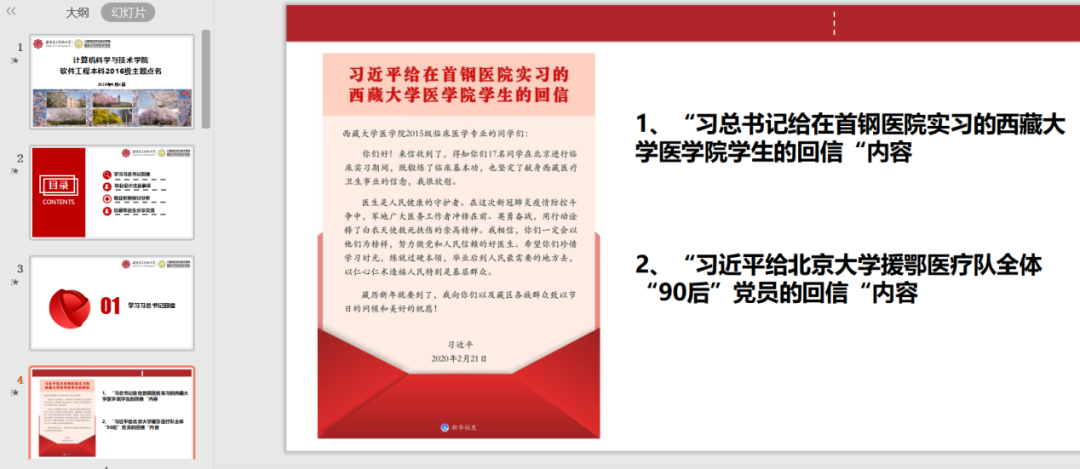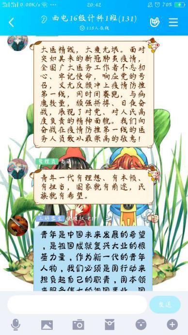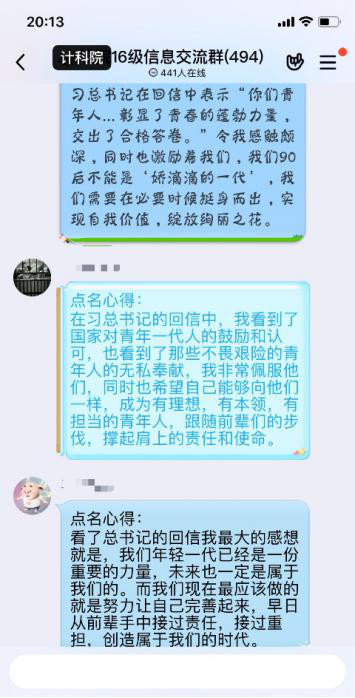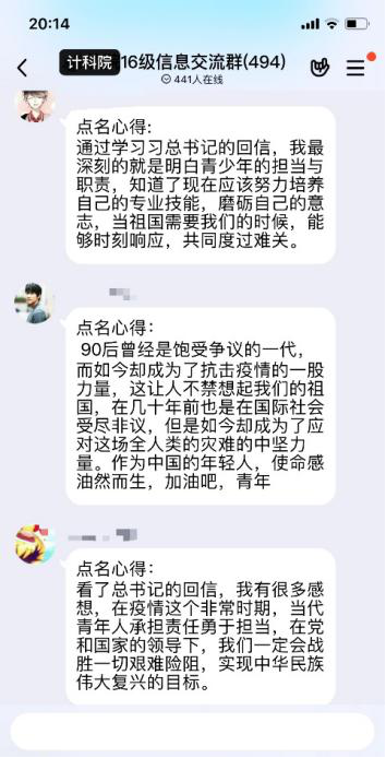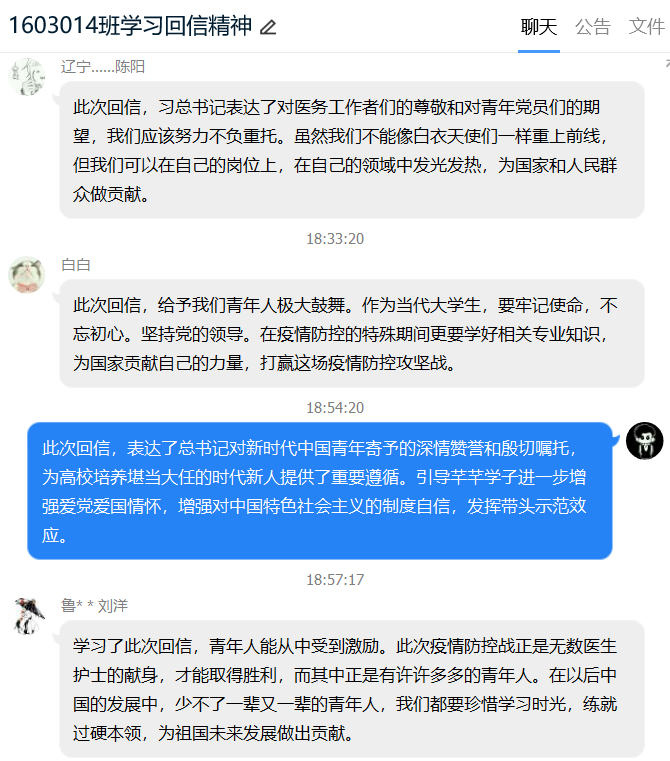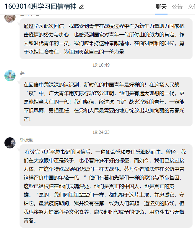 主题点名之后同学们感触良多,本科2017级学生在点名之后纷纷就总书记回信内容撰写心得体会,表达对西藏大学医学院学生以及援鄂医疗队的敬佩之情。本科2016级学生在班群、年级群中就总书记回信内容、就业择业问题开展了积极的讨论,同学们踊跃发言,气氛热烈,纷纷表达自身所思所悟,坚定了为祖国贡献力量的决心。