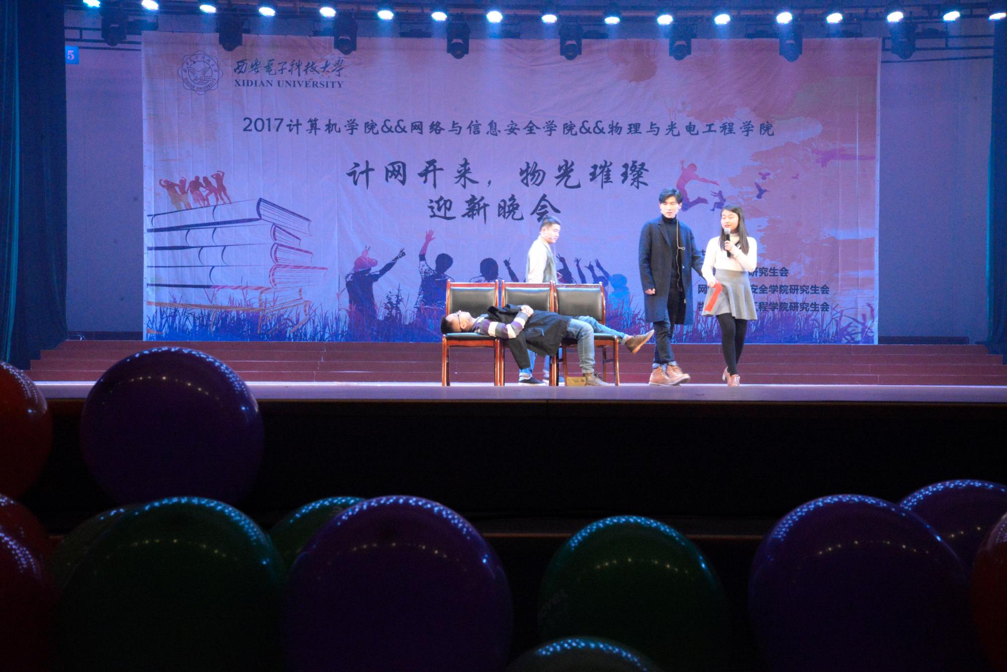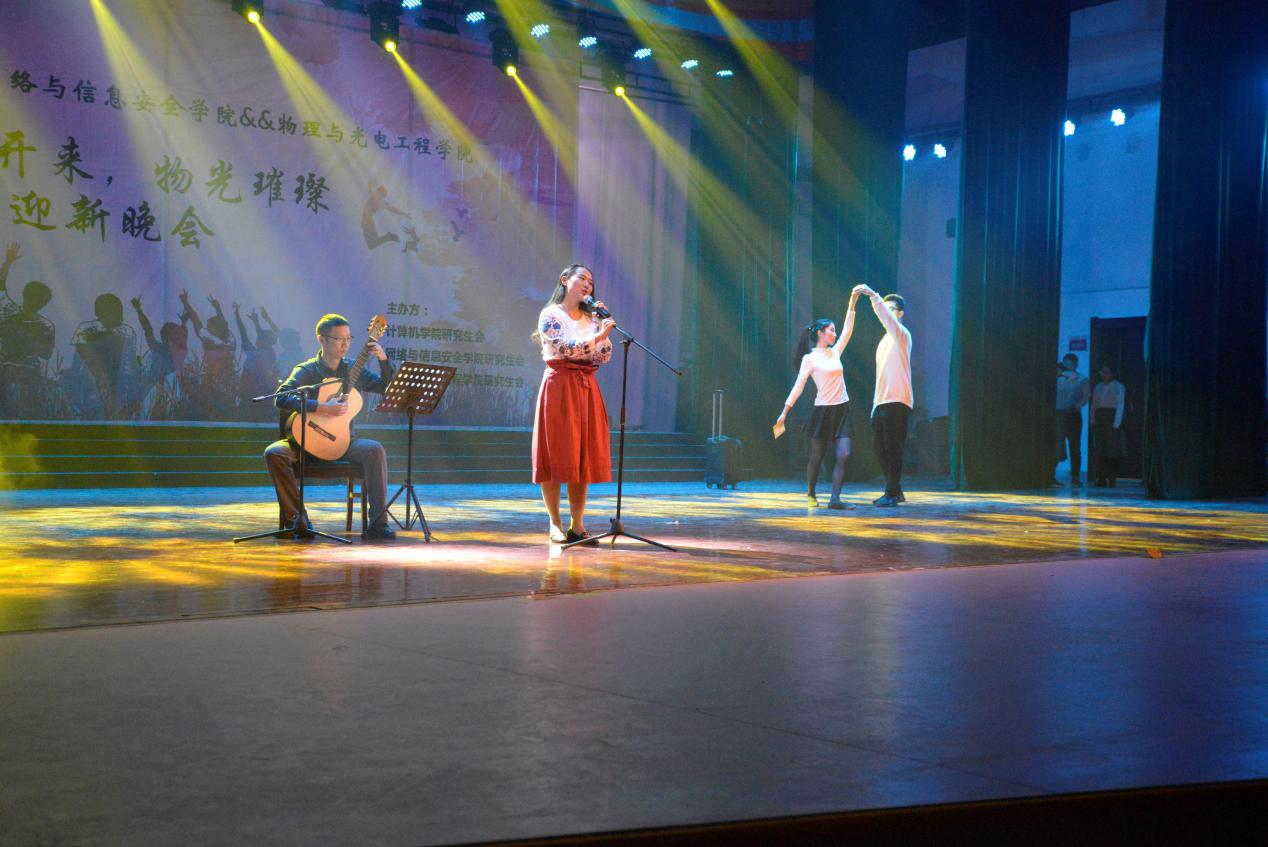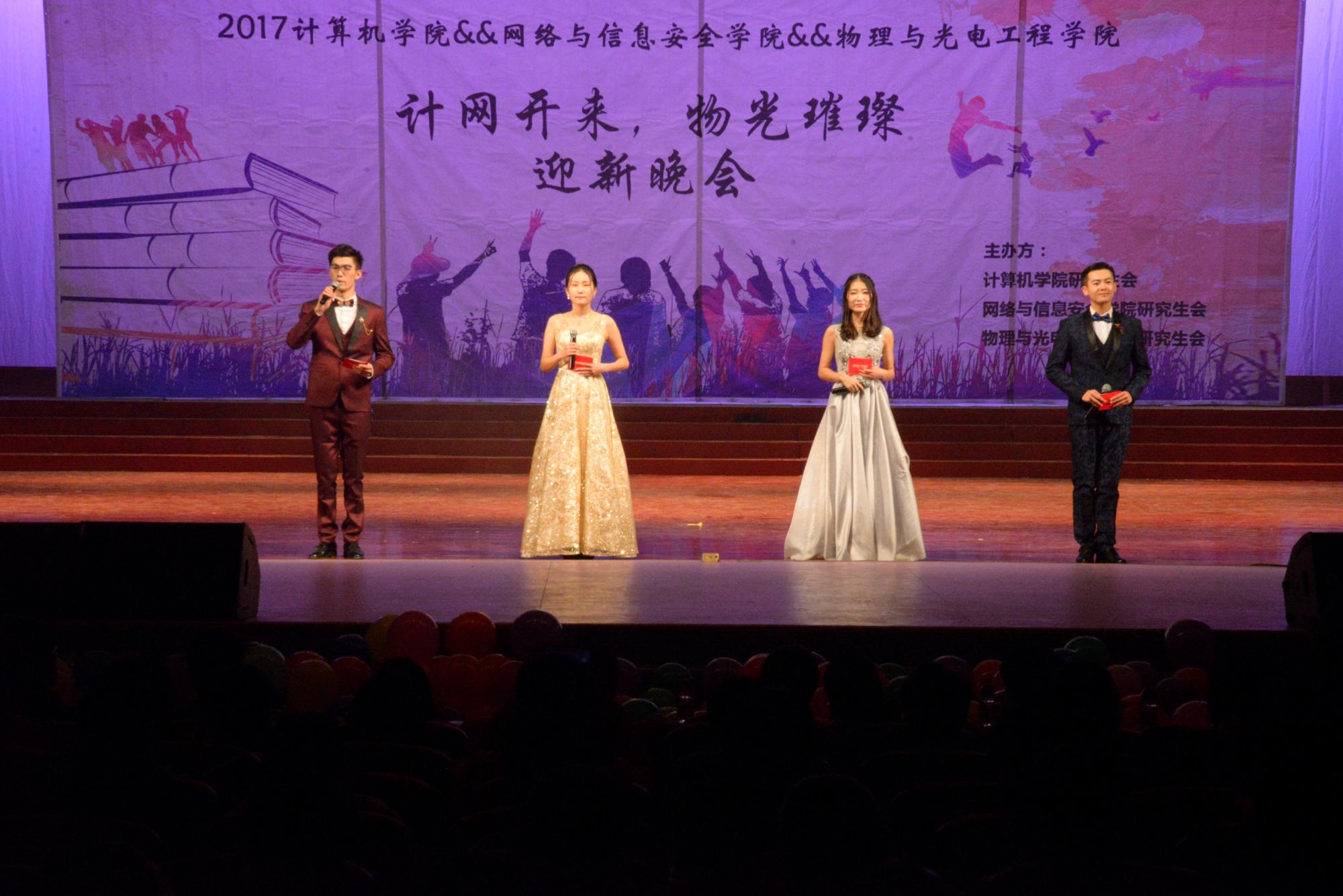 11月16日晚,计算机、网络与信息安全、物理与光电工程三个学院联合举办了“计网开来,物光璀璨”迎新晚会。计算机学院院长王泉、党委副书记党文学、副院长王卫东,网络与信息安全学院党委副书记张美茹,物理与光电工程学院党委书记杨光暐、党委副书记 林波,计算机学院研究生辅导员张尚伟,网络与信息安全学院研究生辅导员陈强出席晚会,与同学们一起观看了演出。