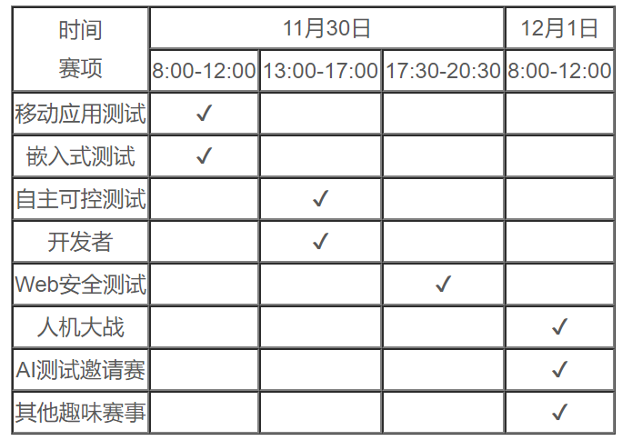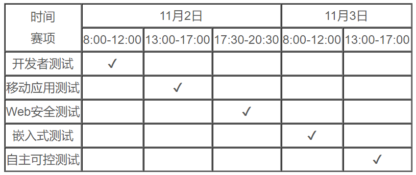 预选赛时间为10月26-27日。预选赛形式为互联网比赛,不限制比赛地点。参赛选手可任选赛项参赛,在时间不冲突的前提下可参加多个分项赛比赛。各分项赛具体比赛时间如下: