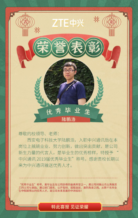 (通讯员 同榛)近日,学院收到中兴通讯股份有限公司人力资源部发来的喜报:在刚刚结束的中兴通讯2019届优秀毕业生评选中,yl7703永利集团2019届软件工程专业硕士毕业生陆鹏浩荣获中兴通讯2019届优秀毕业生称号。