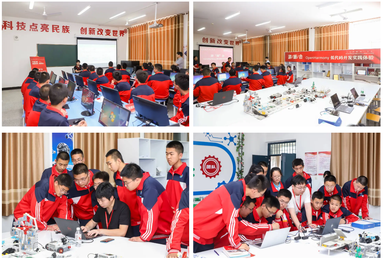 论坛结束后,同学们在OpenHarmony项目群技术指导委员会老师们的指导下参加“游‘源’会——OpenHarmony低代码开发实践体验”活动。OpenHarmony科普介绍、2048小游戏体验、编程开发入门知识、青少年开源开发板实践教具等丰富多彩的体验环节让同学们走近科技,了解计算机技术,亲身体验编程的乐趣。