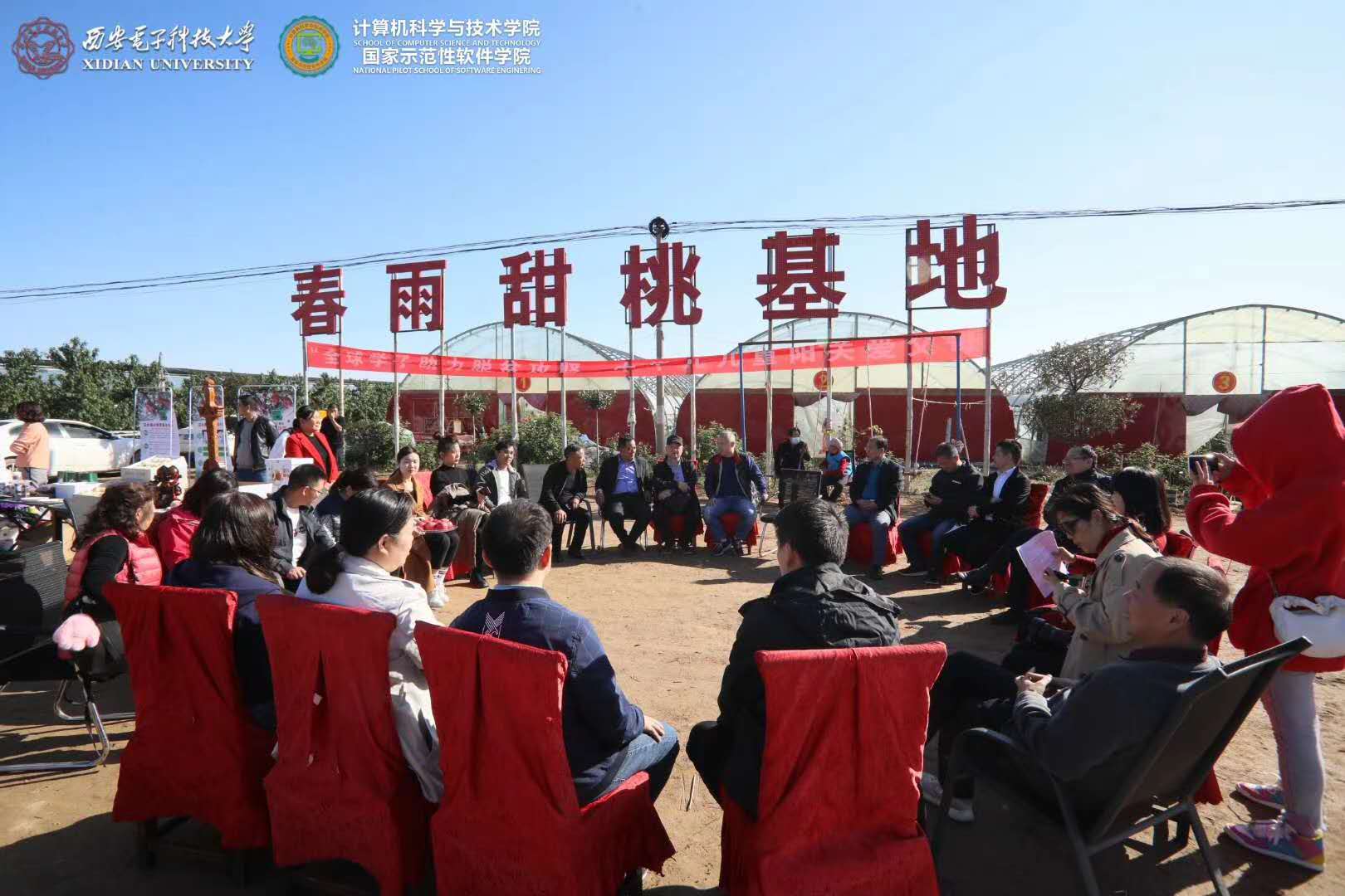 在直播结束后,校扶贫办主任沈强、计科院党委书记李青山、校留学人员联谊会副秘书长王琳、刘志镜教授“山货帮”团队、校留联会计科院分会带货代表、中国农科新闻网执行总编曹雅静及企业代表等围坐在春雨甜桃合作社的桃园里,举行了题为“田间擦碰科技富农新火花,地头共绘智慧农业新画卷”的科技扶贫座谈。