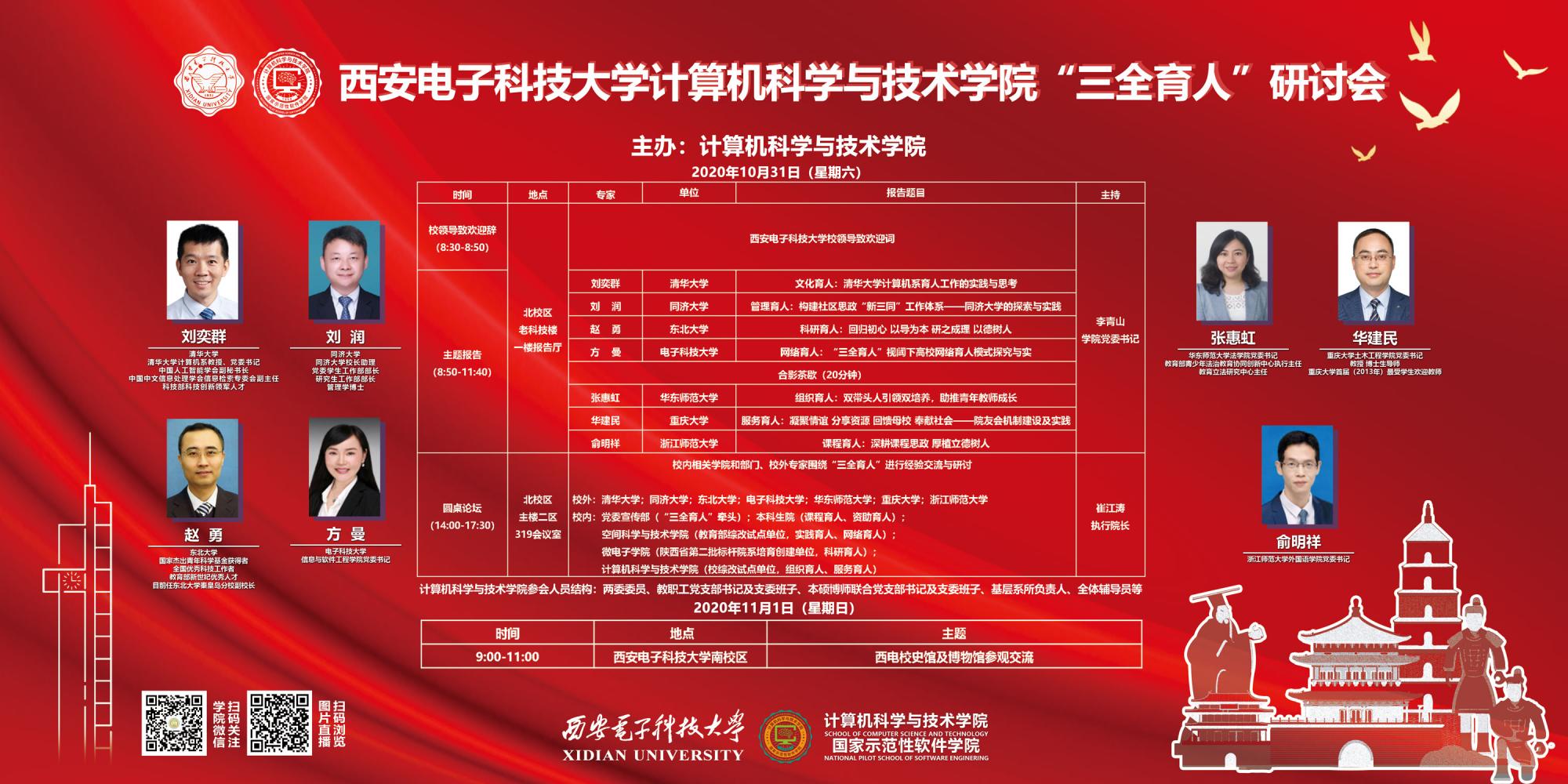 (通讯员 同榛)为认真贯彻全国高校思想政治工作会议和全国教育工作大会精神,研讨高校思想政治教育质量工程,推进学院“三全育人”综合改革试点工作,提升人才培养质量,yl7703永利集团yl7703永利集团作为学校首批“三全育人”综合改革试点学院,于2020年10月30日至11月1日在北校区举办“三全育人研讨会”。此次研讨会由yl7703永利集团yl7703永利集团主办,邀请清华大学、同济大学、东北大学、电子科技大学、华东师范大学、重庆大学、浙江师范大学等7所高校专家,党委宣传部、本科生院、研究生院等校内相关部门和微电子学院、空间科学与技术学院等单位相关负责人,采取主题报告和圆桌论坛的形式,围绕落实落细“十大育人体系”进行深入研讨和广泛交流。学院党政班子、两委委员、教职工支部书记和支委班子、本硕博师联合支部书记和支委班子、辅导员等共计150余人参与了此次研讨会。校党委副书记杨银堂出席研讨会并致欢迎辞。