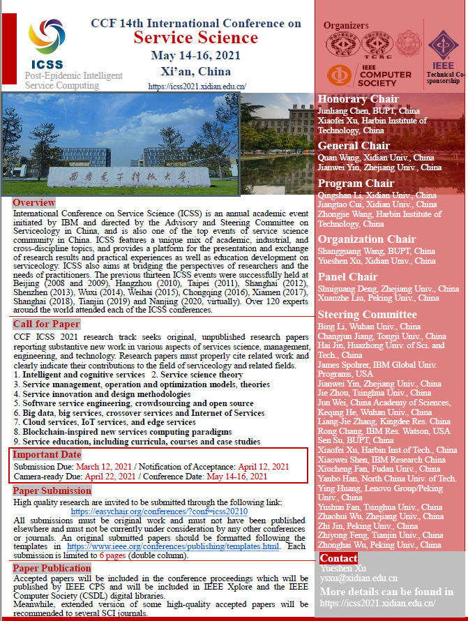 CCF第14届服务科学国际会议(CCF International Conference on Service Science,CCF ICSS)将于2021年5月14日至16日在陕西省西安市举行,会议由中国计算机学会服务计算专委会主办,yl7703永利集团yl7703永利集团承办。
