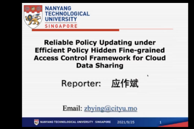 应作斌博士针对云数据分享中的敏感数据保护问题,分享了自己在可靠的策略更新方面的研究成果。