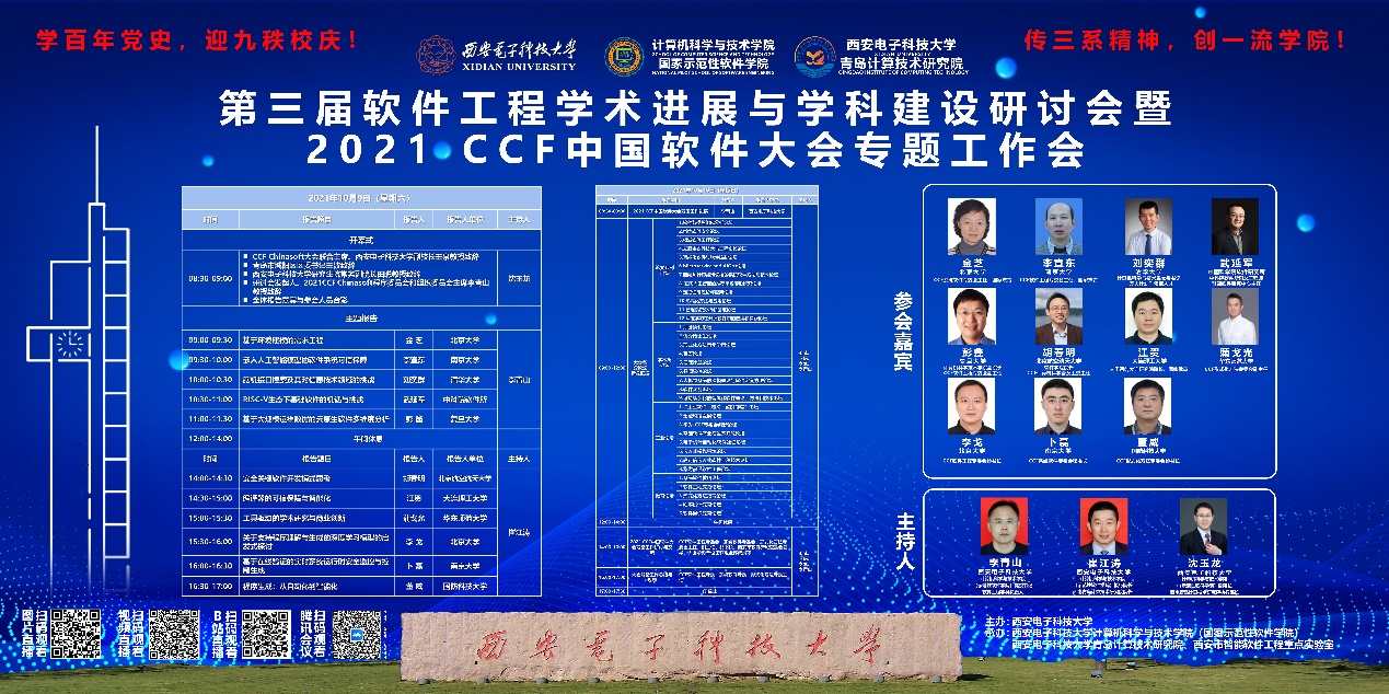 (通讯员 徐悦甡)2021年10月9日至10日,第三届软件工程学术进展与团队建设研讨会暨2021 CCF中国软件大会专题工作会在yl7703永利集团青岛计算技术研究院成功举办。会议由yl7703永利集团软件工程学科主办,yl7703永利集团、yl7703永利集团青岛计算技术研究院与西安市智能软件工程重点实验室承办。会议通过线上线下结合的方式进行,线下举办地为西电青岛产教融合研究生联合培养基地。