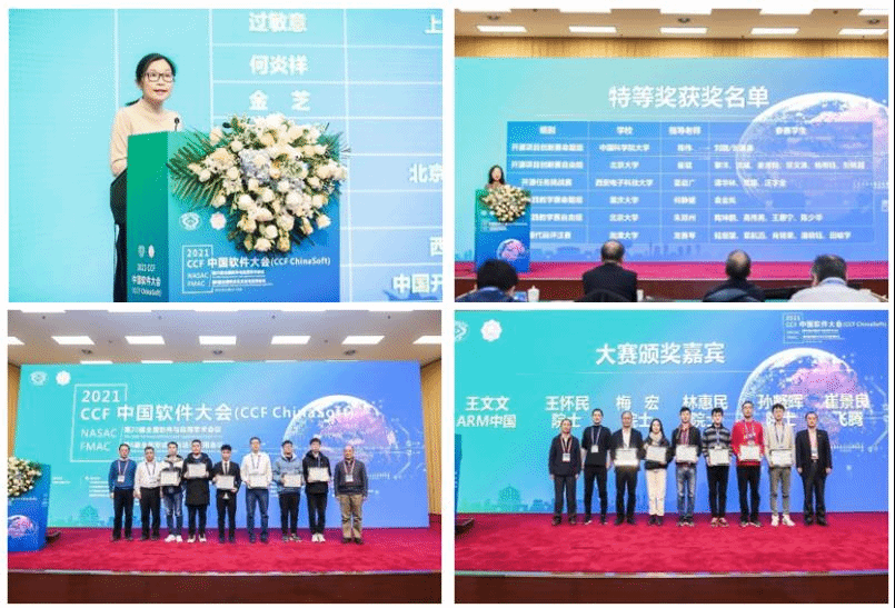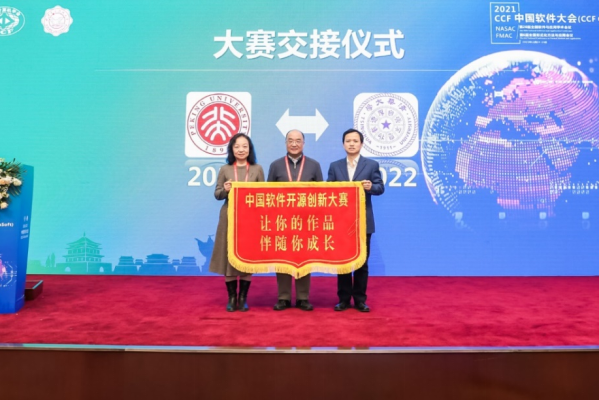 第四届中国软件开源创新大赛举行了颁奖仪式,由金芝教授主持。王怀民院士致辞并指出本届大赛与之前大赛相比的创新与不同点,感谢大赛组委会所有工作人员的辛勤付出,同时祝贺各个获奖团队。大赛组织委员会主席、北京大学周明辉教授代表大赛组委会介绍大赛情况。金芝教授代表大赛组委会宣读获奖名单,本届大赛设有四个赛道,参赛人数超过3.6万人,参赛高校超过1400所。大赛设立了特等奖、一等奖、二等奖等奖项,共有6支队伍获得大赛特等奖,30支队伍获得一等奖。王怀民院士、孙凝晖院士、飞腾公司崔景良先生为一等奖获奖团队颁奖,林惠民院士、梅宏院士、ARM中国公司王文文先生为特等奖团队颁奖。王怀民院士宣布大赛成果与新一届大赛启动。大赛随后举行了交接仪式,下一届大赛承办方代表清华大学胡事民教授接旗并发言。
