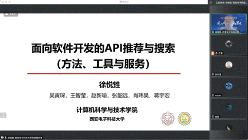 首场报告由智能软件与系统新技术研究所徐悦甡副教授分享,报告主题为“面向软件开发的API推荐与搜索(方法、工具与服务)”。他介绍了团队在基于历史库挖掘的API推荐方法、基于异质信息网络的API检索方法、基于自注意力特征学习的协同项目推荐等方面的研究和实践成果,分享了团队研发的四种服务模式,便于向开发人员推荐与检索API,提高开发效率,包括Windows桌面软件服务、Web门户网站服务、Python项目软件包服务、移动端软件服务。