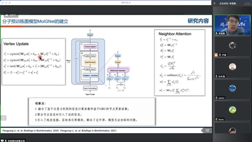 最后,计算生物信息学研究所李朋勇老师分享的报告主题为“预训练图神经网络在药物研发中的应用”。他首先简单介绍了计算机辅助药物设计和AI制药产业化的发展。接着,他围绕人工智能在药物研发领域中的应用介绍了药物研发领域中常用到的深度学习模型,并重点讲述团队研发的预训练图神经网络模型在药物性质预测、药物-靶点相互作用和分子优化生成等领域的实际应用。