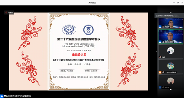 来自中国科学院计算技术研究所的《基于主题信息BERT词向量的推特文本立场检测》(姜燕、高金华、沈华伟)获得会议最佳论文奖。