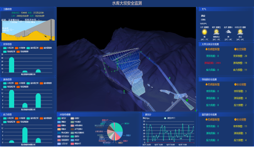 大坝安全监测系统采用三维建模技术全方位、立体化展示传感器网络时空数据。基于时空大数据的可视分析技术,提供交互式的数据查询、可视化展示与统计分析等功能。基于人工智能方法,实现大坝的安全预警、报警等智能安全隐患分析,从而达到提升水库运行管理信息化水平、确保工程安全的目的。